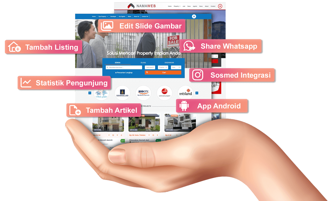 Website tipe ini untuk agency atau perusahaan agent property yang memiliki banyak agent serta ingin lebih professional. Masing - masing agent mempunyai area admin sendiri untuk memasang listing iklan mereka secara mandiri, cepat, dan mudah.